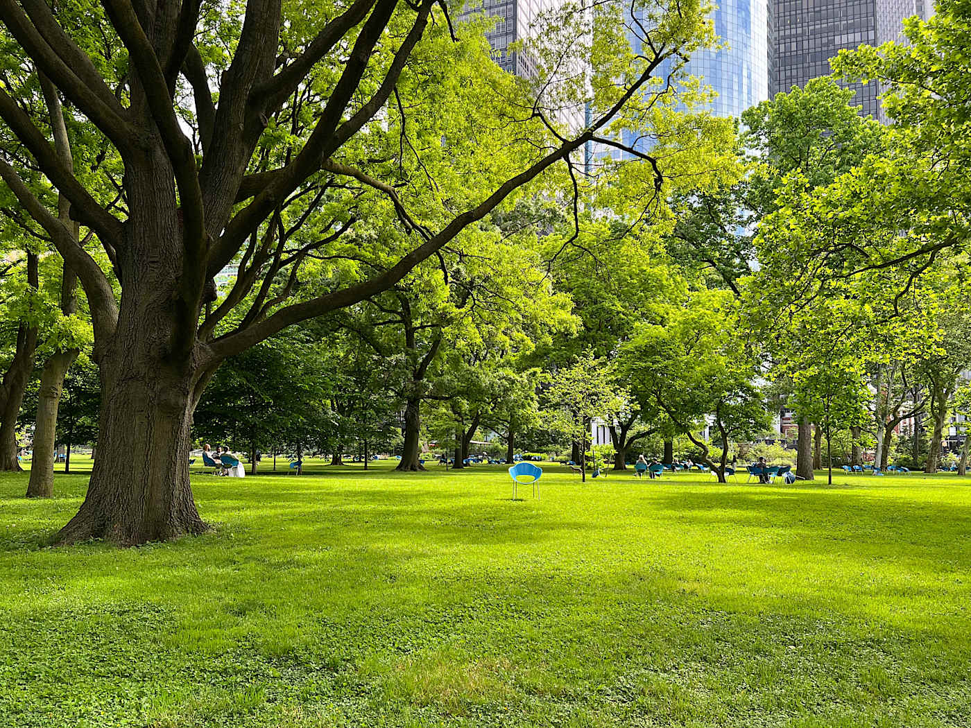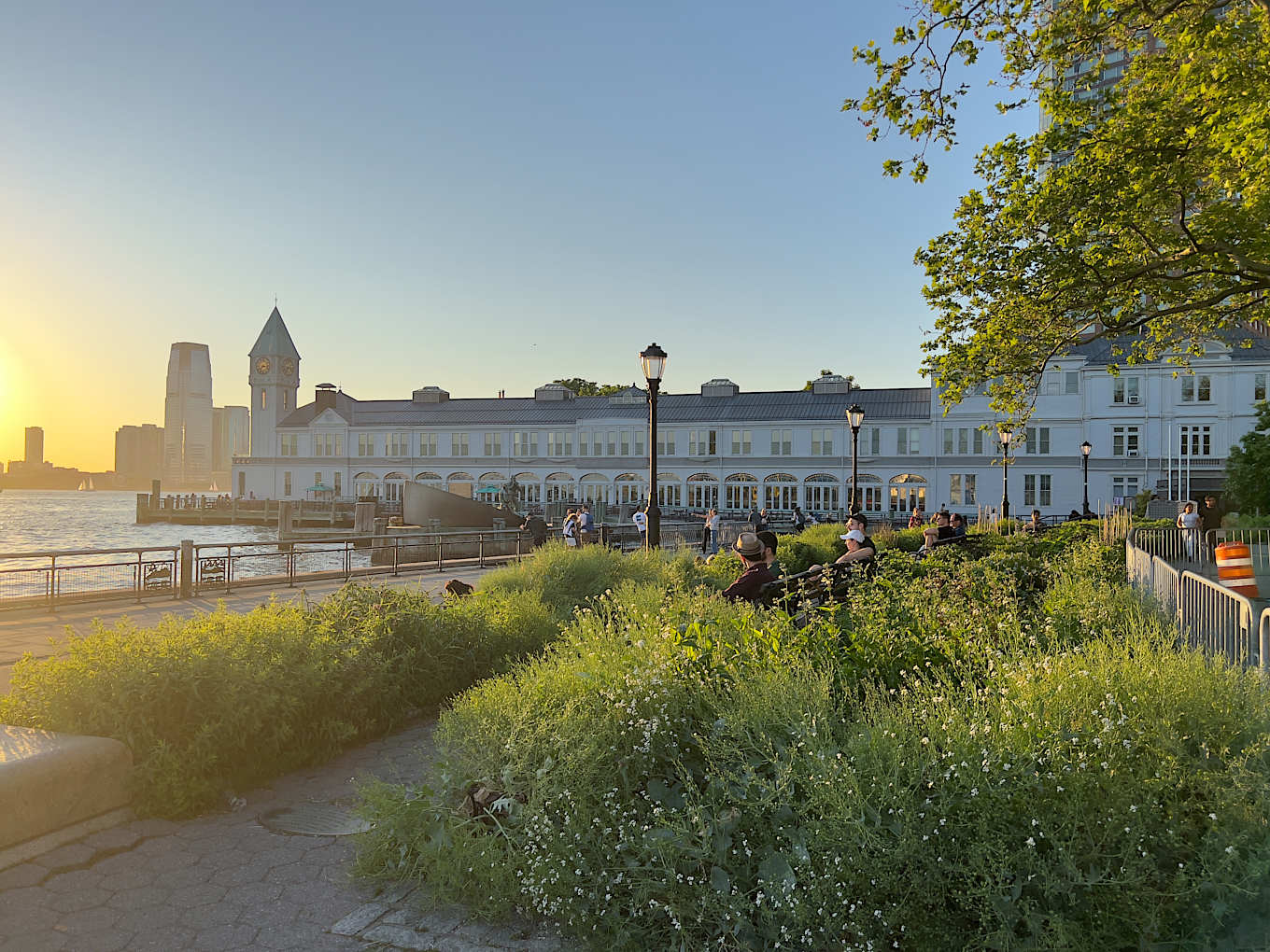 FiDiの南端にはバッテリーパークシティにかけて広がる公園 The Battery があり、散歩、ランニング、ベンチや芝生での日光浴、ピクニック、魚釣りをする人々が見られます。