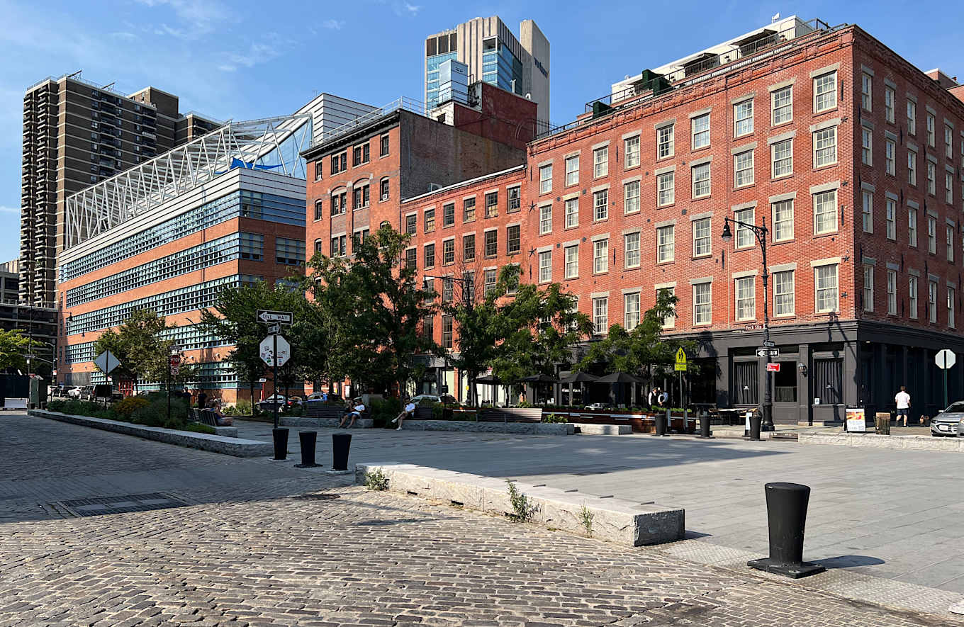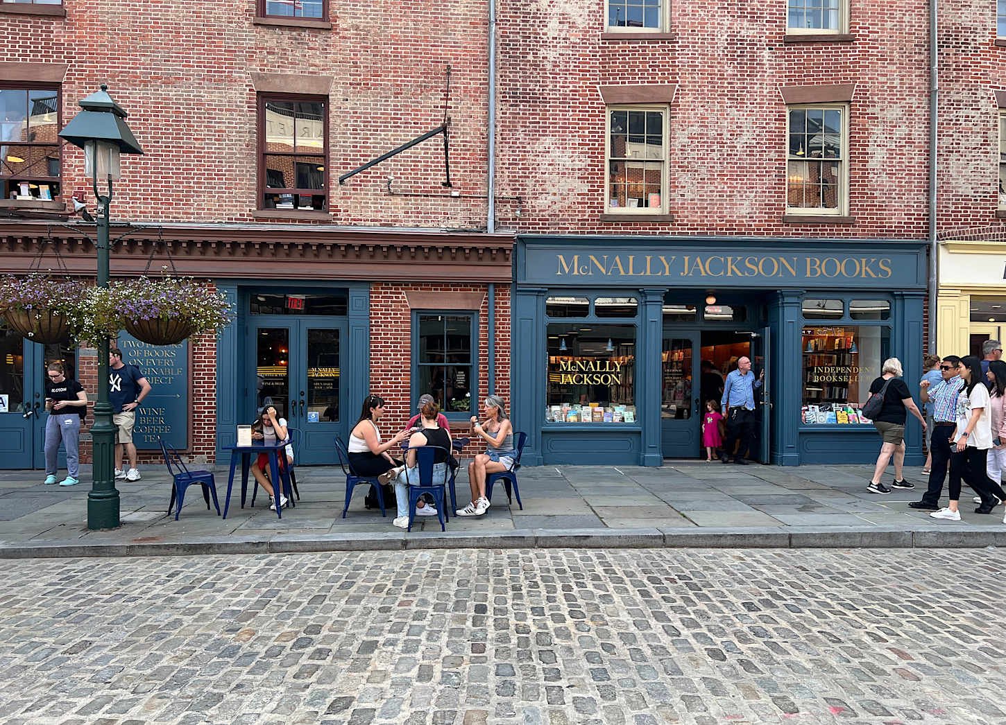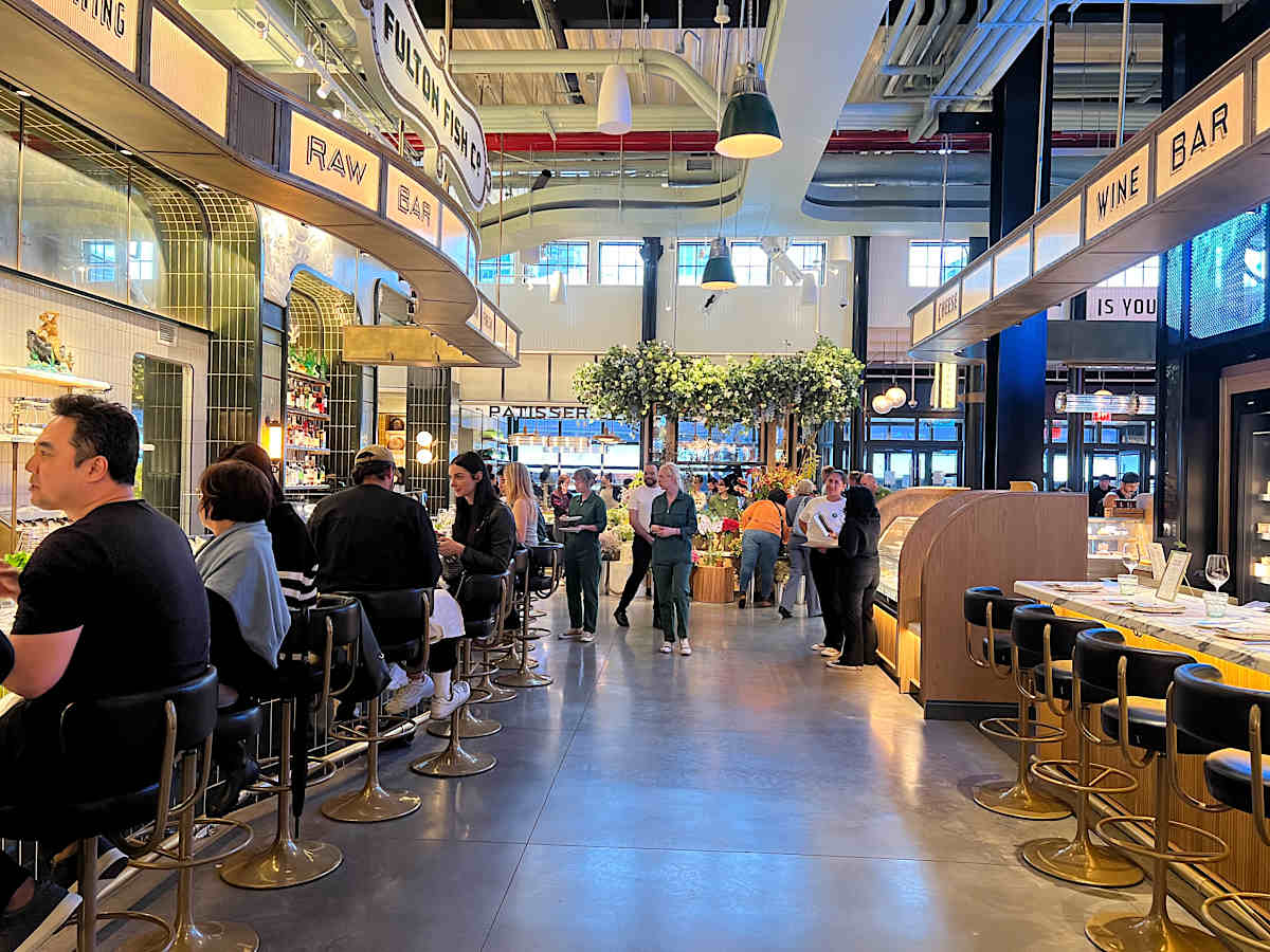 The South Street Seaport (シーポート)は、ファイナンシャルディストリクト東部の歴史的保存地区です。蒸気船があった頃からの建物を保存しつつ、博物館やいろいろな小さな商店や飲食店で賑わっていて、屋外でアートの展示が頻繁に行われます。独立系書店の McNally Jackson Books も新店舗を構えました。この地区に書店が現れたのは意外でしたが、元々人気がある書店ですし、観光客も近隣住民も立ち寄れる場所として、この地区に良い効果をもたらしているように見えます。東にイーストリバー沿いまで抜けると、一帯は Pier (ピア/埠頭)で、フェリーの発着場もありますが大部分はレストランを中心とした商業地区になっています。特に、Fulton Fish Market がブロンクスに移転した跡地が2022年に再開発され、ジャン=ジョルジュ(Jean-Georges Vongerichten)が経営に関わる "The Tin Building" ができました。これは多数のカジュアルなレストランと食料品及び物品販売の複合施設ですが、テーマパークの要素があり、体験による満足も目指した、ジャン=ジョルジュ版の Eataly と目されています。