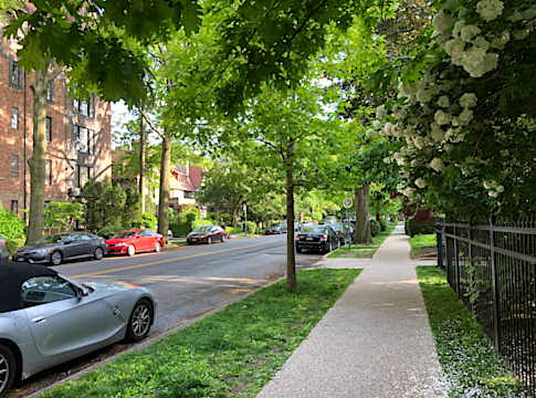 ロングアイランド鉄道 (LIRR) フォレストヒルズ駅の南側や、幹線道路のクイーンズ・ブールバード Queens Boulevard 北側の一部地区には、芝に囲まれた歴史ある一戸建て住宅が建ち並び、郊外のような風情があります。