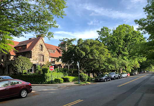 フォレストヒルズのうち、ロングアイランド鉄道 (LIRR) の南側の大部分と、クイーンズ・ブールバード北側の Forest Hills High School 付近までは、整然とした区画の高級住宅地 (一部は教会) で、チューダー様式 (ドイツ風の、白い壁に柱や梁が見える木組みで、屋根に勾配がある建築様式) やジョージア様式の一戸建て住宅が並んでいます。その多くは芝や低木で囲まれた前庭や裏庭を有しています。このエリアにタウンハウスやコープもありますが少なく、賃貸専用ビルは一つのようです。
