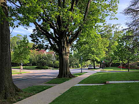 整然とした住宅地の中でも、LIRRフォレストヒルズ駅南側の 175エーカー (300 x 260メートル相当)は Forest Hills Gardens と呼ばれ (下の地図中のオレンジ色の部分)、富豪の遺産を受け継いだRussell Sage財団が用地取得と街づくりを行いました。街づくりは、その当時英国で巻き起こっていたガーデンシティ運動 (Garden city movement - Wikipedia) に基づいて構想されました。ガーデンシティとは、大都市 (昔の事なのでスラムもある) とは少し離れ自然に近い場所にあって、良い賃金の雇用や商業的・文化的なものへのアクセスと、空気の綺麗さや居住コストの低さを併せ持った、都会と田舎の中間的なコミュニティーです。Forest Hills Gardensに即して言えば、駅周辺やエリアの南部に広場や商業地を配置し (機能の分離)、その間の住宅地には緩やかなカーブを描いた道路を作ったり、大通りから入り込んだ私道的なドライブウェイの先に住宅を配置したこと (交通・自然・公私の空間の段階的遷移) も、ガーデンシティの理想を具現化して各種の要素を調和させた一例です。