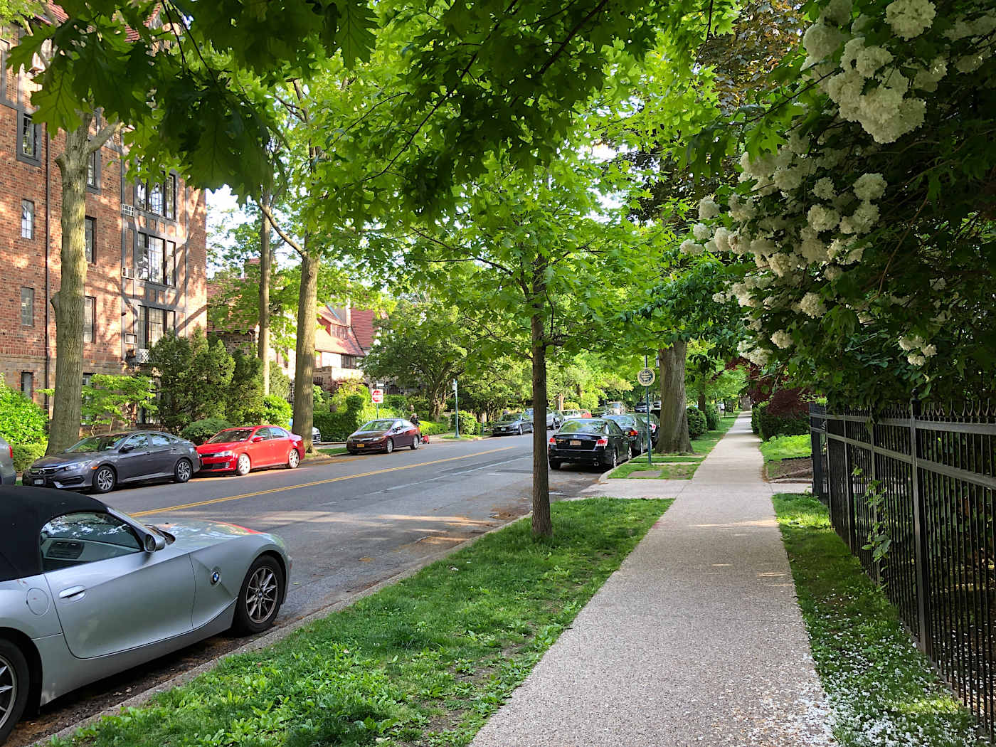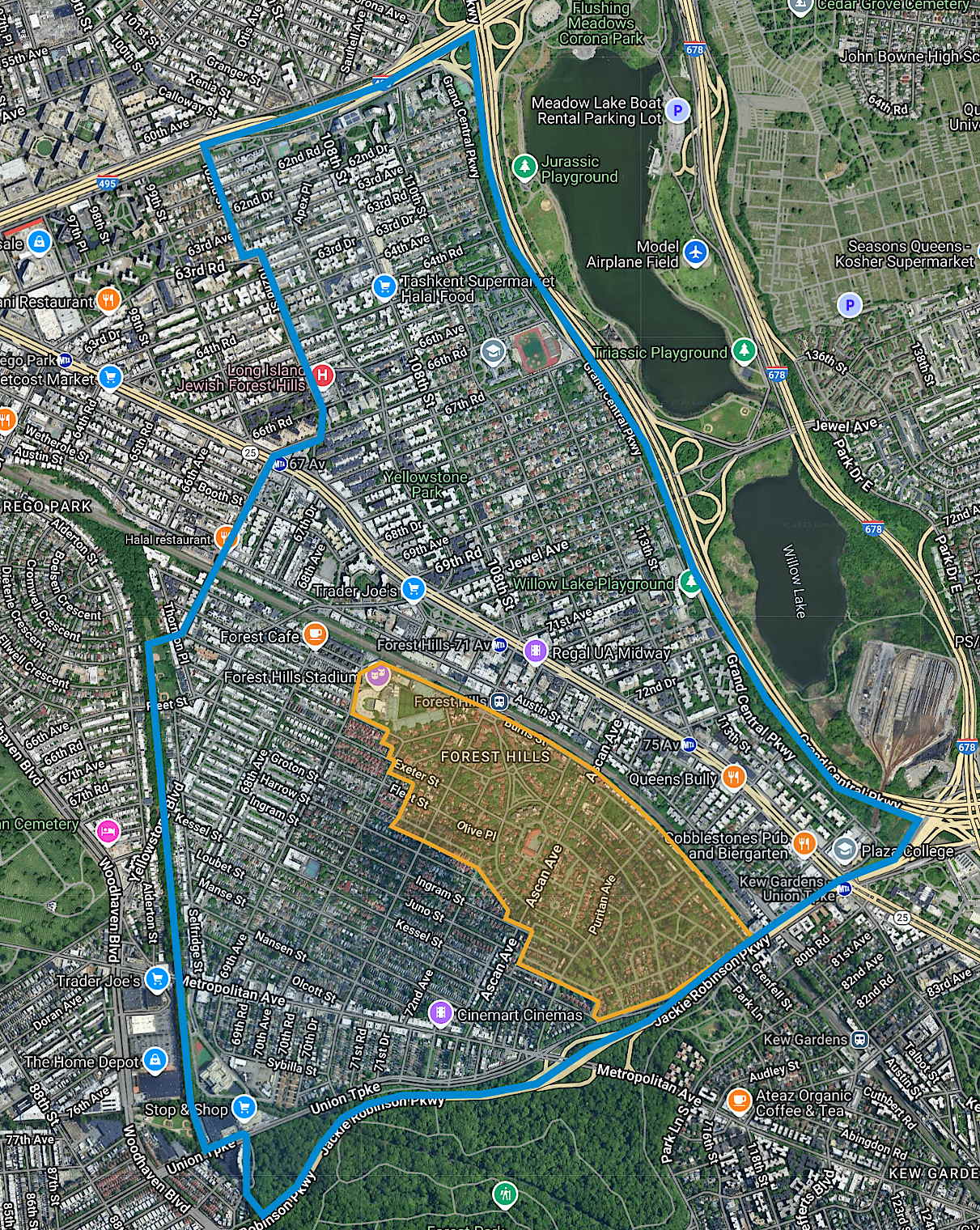 フォレストヒルズはクイーンズのほぼ中央に位置し、19世紀終わりから20世紀始めにかけて一戸建て住宅や集合住宅が全域で開発されて発展した地区です。(それまでは、17世紀から19世紀にヨーロッパから入植した少数の農場主の土地でした。) 第二次大戦前の住人は白人の中産階級が中心でした。戦中にユダヤ系ポーランド人らがナチスから逃れて多く移住し、戦後にアジア系の移民も増加し、また1970-80年代には特にロシアやイスラエルからの移民が流入しましたが、それ以上の大きな変化はあまり感じられず、今でも人口構成の偏りに昔の面影があります。