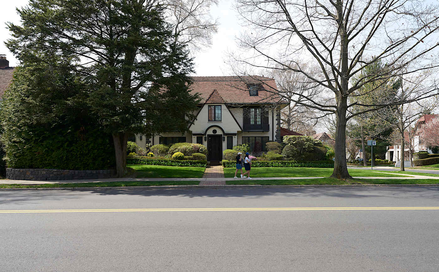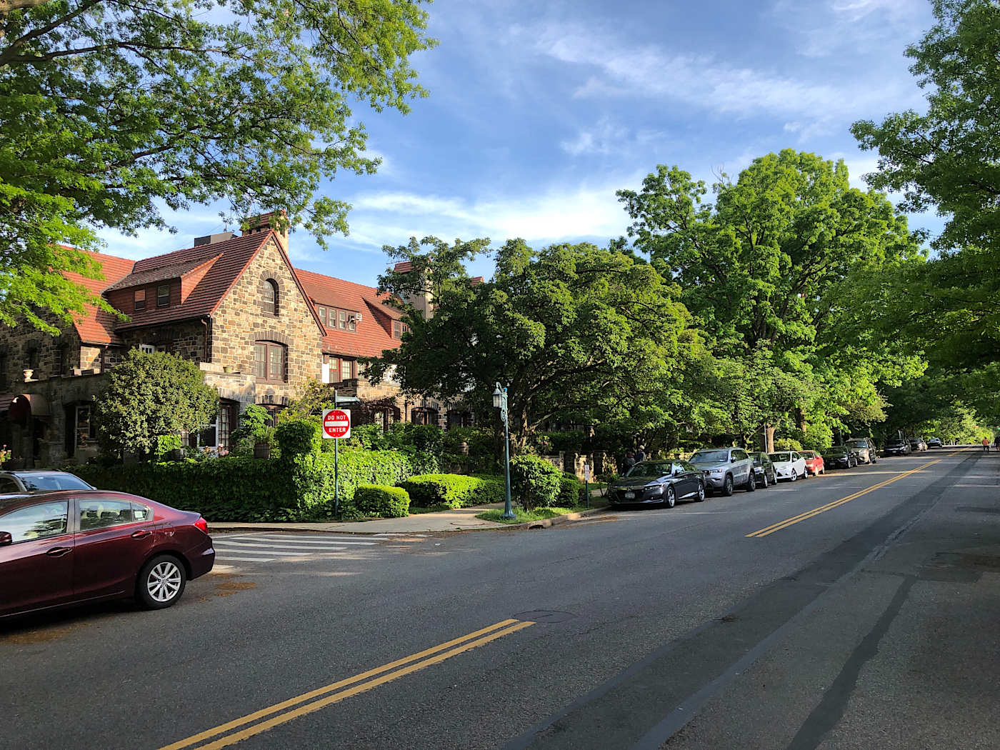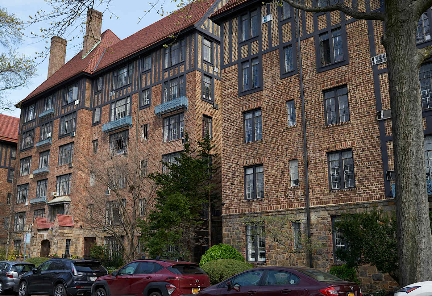 フォレストヒルズのうち、ロングアイランド鉄道 (LIRR) の南側の大部分と、クイーンズ・ブールバード北側の Forest Hills High School 付近までは、整然とした区画の高級住宅地 (一部は教会) で、チューダー様式 (ドイツ風の、白い壁に柱や梁が見える木組みで、屋根に勾配がある建築様式) やジョージア様式の一戸建て住宅が並んでいます。その多くは芝や低木で囲まれた前庭や裏庭を有しています。このエリアにタウンハウスやコープもありますが少なく、賃貸専用ビルは一つのようです。