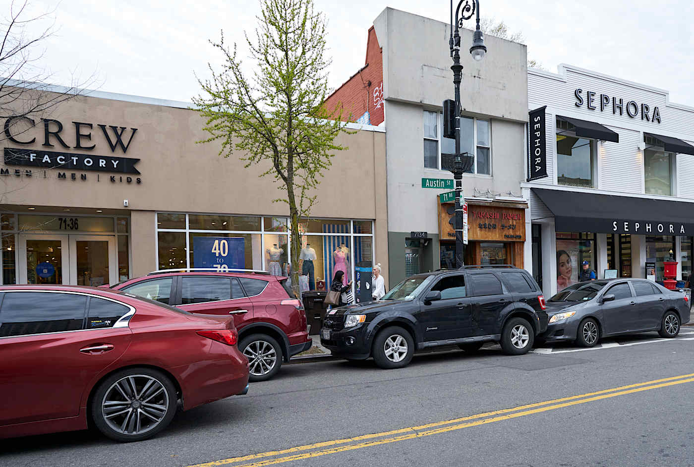 一方で、駅周辺のオースティン・ストリート Austin Street やクイーンズ・ブールバード沿いには、大手アパレルのアウトレットやスーパーマーケット、多数の飲食店、銀行、映画館、GMの中古車販売店、メガネ・時計店、美容院、楽器店、個人経営ブティックなどの商業店舗が多数並び、一般的な郊外とは異なる、どこかの地方都市を思わせます。