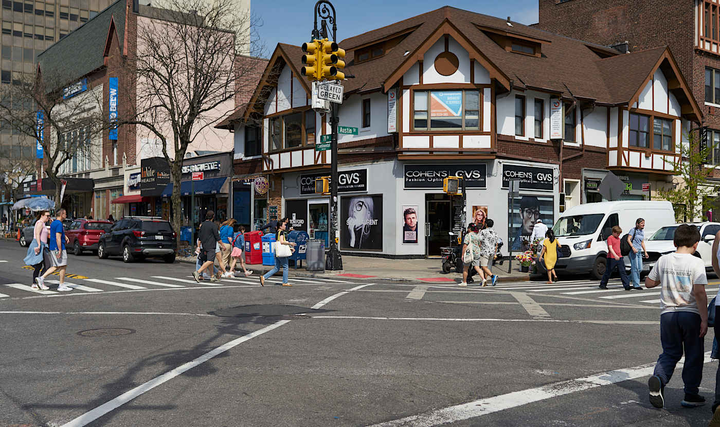 地下鉄の駅はクイーンズ・ブールバード沿いにあり、オースティン・ストリートから1ブロック北でもあります。僅かですが最近建てられた賃貸専用ビルやコンドミニアムはこの付近にあります。他に映画館、レストラン、コンビニエンスストア (CVS, Walgreen)、銀行、楽器店などがあります。細長い公園にはチェスで遊ぶ人などが集まっていることがよくあります。週末には近郊の農家やフードベンダーが出店しています。