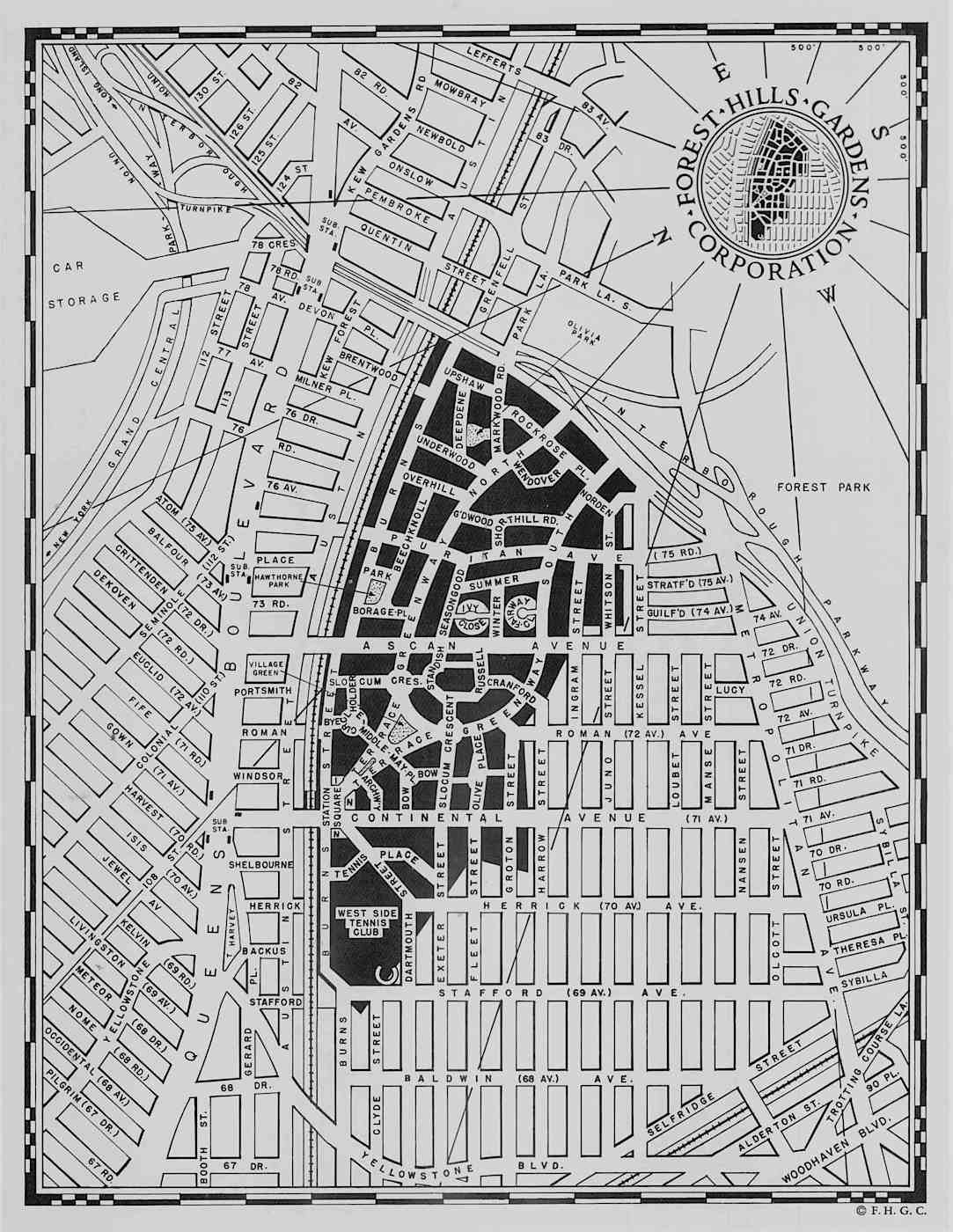 整然とした住宅地の中でも、LIRRフォレストヒルズ駅南側の 175エーカー (300 x 260メートル相当)は Forest Hills Gardens と呼ばれ (下の地図中のオレンジ色の部分)、富豪の遺産を受け継いだRussell Sage財団が用地取得と街づくりを行いました。街づくりは、その当時英国で巻き起こっていたガーデンシティ運動 (Garden city movement - Wikipedia) に基づいて構想されました。ガーデンシティとは、大都市 (昔の事なのでスラムもある) とは少し離れ自然に近い場所にあって、良い賃金の雇用や商業的・文化的なものへのアクセスと、空気の綺麗さや居住コストの低さを併せ持った、都会と田舎の中間的なコミュニティーです。Forest Hills Gardensに即して言えば、駅周辺やエリアの南部に広場や商業地を配置し (機能の分離)、その間の住宅地には緩やかなカーブを描いた道路を作ったり、大通りから入り込んだ私道的なドライブウェイの先に住宅を配置したこと (交通・自然・公私の空間の段階的遷移) も、ガーデンシティの理想を具現化して各種の要素を調和させた一例です。