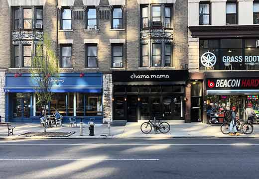 Amsterdam Ave や Columbus Ave 沿いの 75丁目から南は、Jacques Torres Chocolate、Blue Bottle Coffee、Joe & The Juice、その他サラダやメキシカンフードなど、知名度が高いチェーン店が並びます。75丁目より北には知名度が高い店が非常に少なく、レストラン、バー、グルメな顧客を意識したカフェ、小さい商店が多数となります。日本でもおなじみのサラベス(Sarabeth’s)の一店舗があるのも Amsterdam Ave です。タイなどアジア系のレストランが比較的多くみられます。アッパーイーストサイドの東側にあるような、古くからのイタリアンレストランはやや少ない気がします。