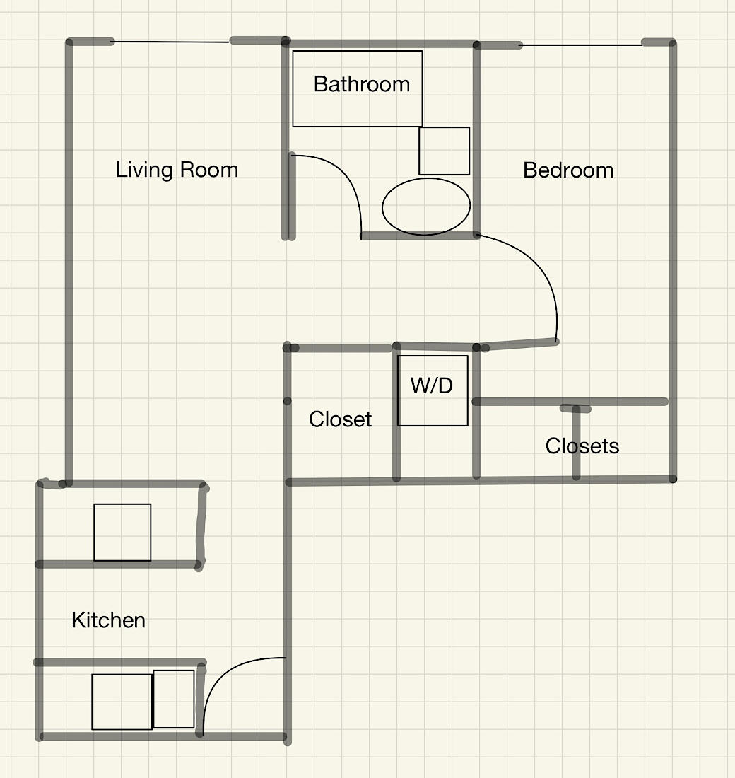 リビングルームとベッドルームの間にバスルームが配置されることで、バスルームに窓をつける設計が容易になるという副産物があります。リビングルームとベッドルームが隣り合わせの1ベッド住宅においては、バスルームが上の図の Closet と W/D(室内洗濯機&乾燥機)の位置に配置されることが多く、そうなると窓を付けられないことが大多数となります。
