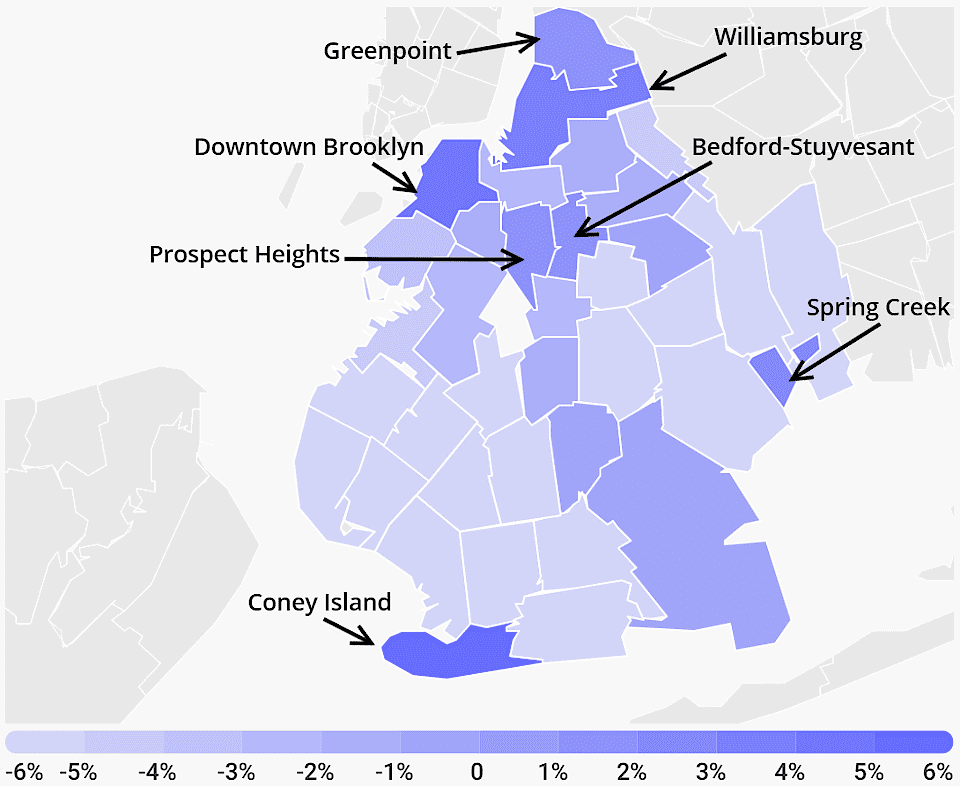 ブルックリンやクイーンズでも、マンハッタンまで地下鉄で一駅から数駅のエリアには人口が流入しています。上と同期間を対象としたこの統計を見るまでもなく、近年はDowntown Brooklyn, Fort Greene, DUMBO, Williamsburg, Greenpointの新しめの住宅で、家賃がマンハッタンよりほんの少し安いだけの水準まで上がっていましたので、人気は多くの人に認識されていただろうと思います。