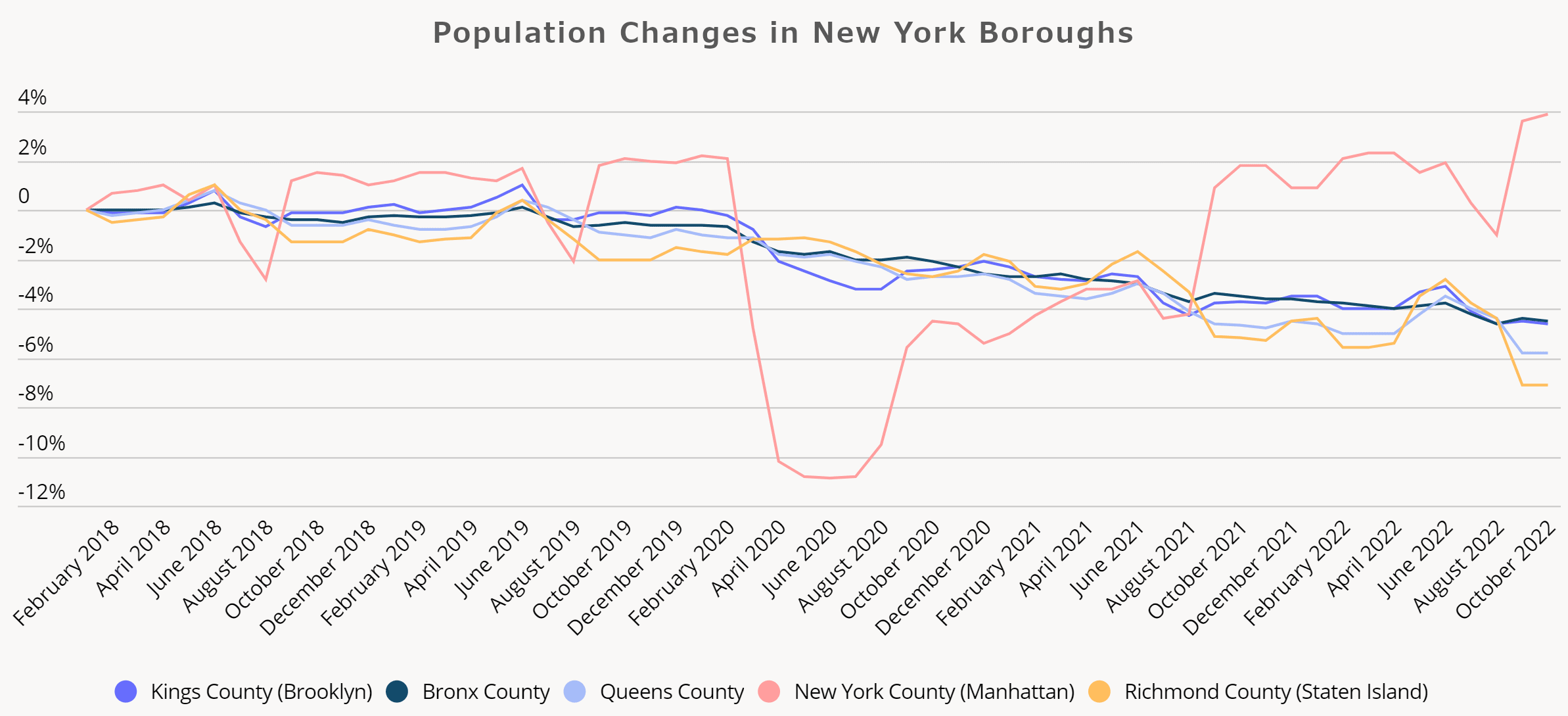 しかしマンハッタンは復活しました。正確に言うと、復活以上です。パンデミックから2年後の2022年2月に人口が完全に(つまり増減ゼロになるまで)回復しました。2年6か月後の2022年10月にはパンデミック前を1.8%上回るまで増加しました。当チームがこれまで賃貸市場の変化として発信してきた通り、マンハッタンの人気が一層高まり、短期間で人口が大きく伸びています。