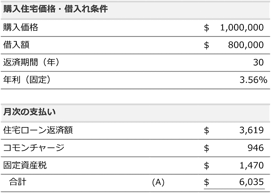 まず知るべきことは、購入した場合のローンの返済額、コンドミニアムのコモンチャージ、固定資産税を合わせた、毎月の支出です。それが $6,035 だとします(下の表の '(A)')。