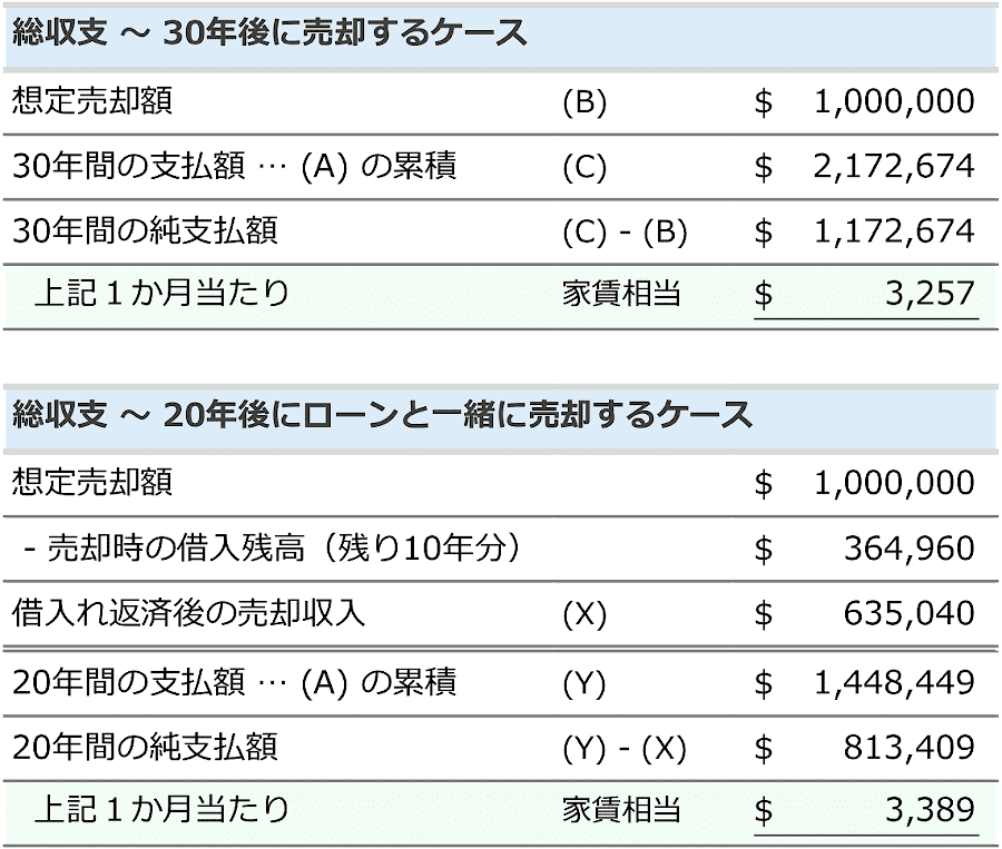 下の一つ目のシナリオは、ローンを完済した30年後にこのコンドミニアムを売却し、故郷で年金生活を送るというものです。コンドミニアムの売却額から 30年間の支払総額を差し引いた、30年間の純支払額を求めます。そこから1か月当たりの純支払額を計算します。