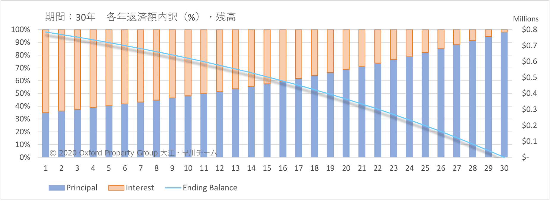 上記により、返済開始直後はなかなか残高(Ending Balance - 水色のライン、縦軸は右側)が減りません。借入期間の三分の一が経過した10年後に、まだ元本の 77.6% が残っています。