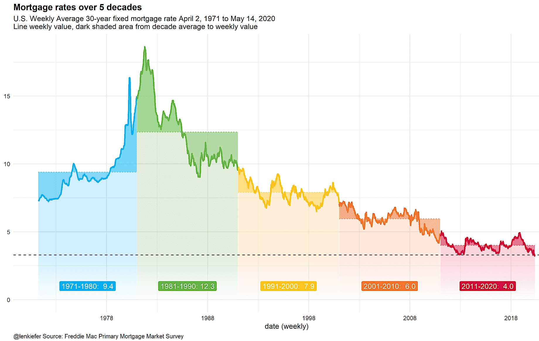 現在のアメリカは長期金利が過去50年以上で最も低い水準にあり、住宅ローンの金利も同じです。2020年5月現在、30年の固定金利は約 3.5% まで下がりました。信用スコアが高い人の場合、2.7% という例もあります。とても魅力的に聞こえますね。