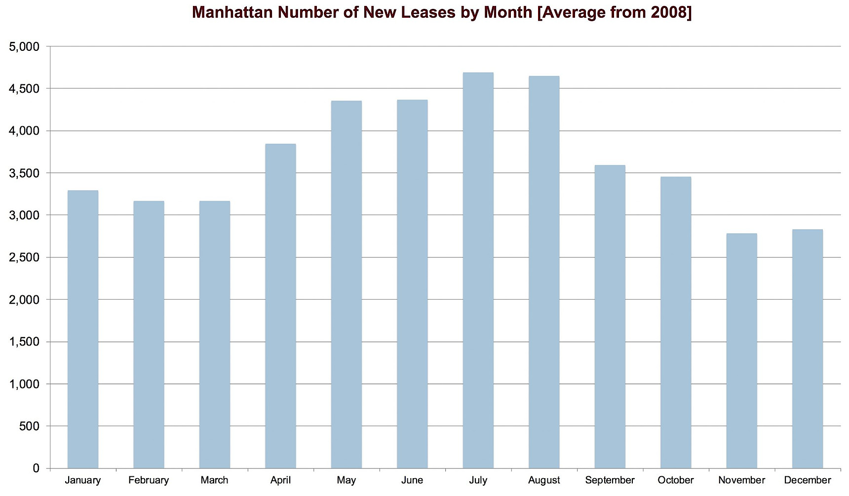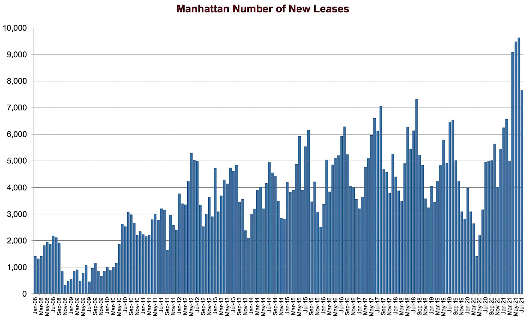 従来、マンハッタンの月別の新規賃貸契約数は7月に最多となることが多く、8月が二番目に多い月でした(下の図)。しかし 2021年は6月が最多であり、その次に多いのは5月と4月でしたから、例年より概ね 2か月早く繁忙期が到来したと言えます。2021年7月に物件をお探しだった方は、6月までほど価格面以外でも良い条件の物件を見つけることが困難で、少ない選択肢の中から決めざるを得ませんでした。