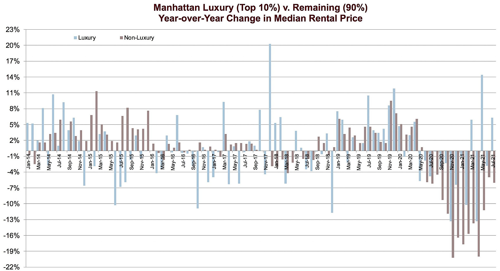需要と供給が合致していない二つ目の分野は、高級住宅です。下の図は、各部屋タイプにおいて家賃が上位 10%の高級住宅を "Luxury"(水色)と分類して、家賃の前年同月比増減率を表しています。好立地、高品質、広い、築浅の要素を兼ね備えていることがほとんどでしょう。パンデミック以降のどの月でも、Luxury の家賃はそれ以外のアパートより減少率が小さく、2021年3月、5月、7月に至っては大きく上昇しました。