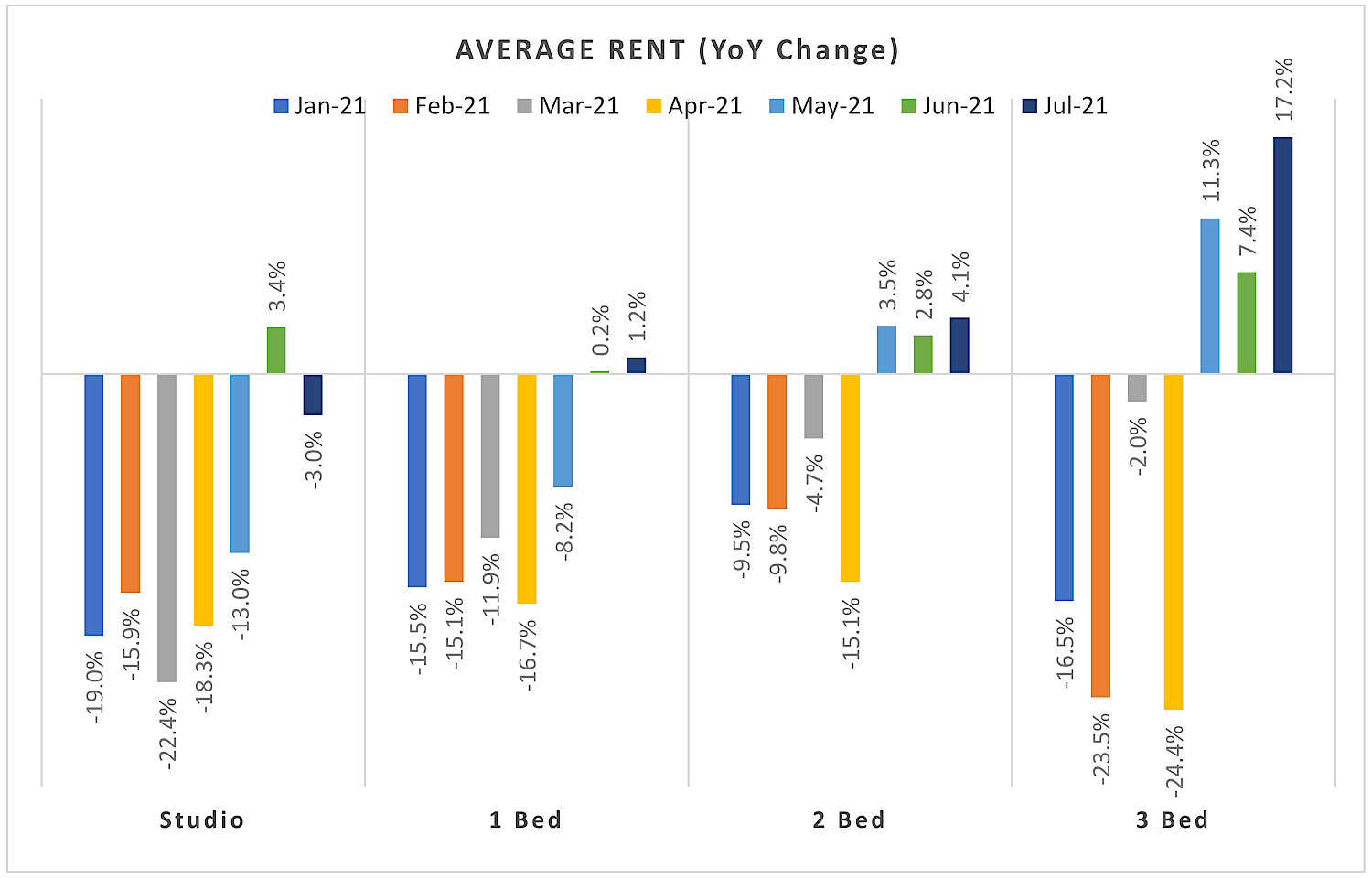 需要と供給が合致していない一つの分野は、1-Bed 以上のアパートです。今年は誰もが、経済的に可能であるなら広い住宅に住みたいと考えているからです。下の図は、2021年1月から7月までの各月に契約された物件の平均家賃を、前年同月からの増減で表したものです。
