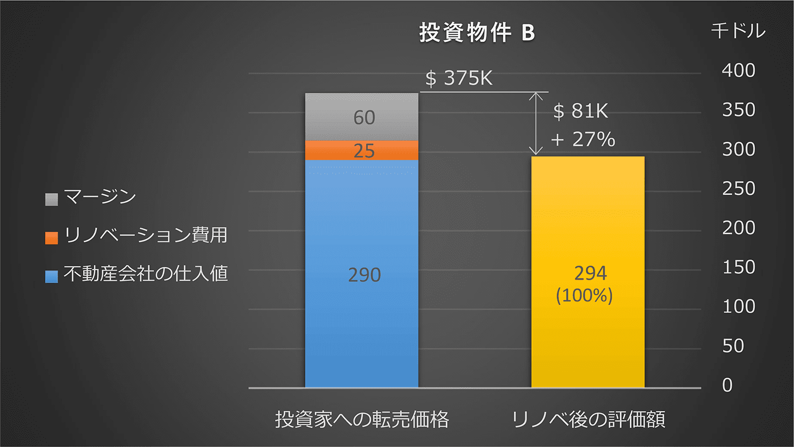もう一つの理由は、アメリカ地方都市の不動産なら、一定数の日本人投資家が購入可能な価格であることです。しかし、立地がいまひとつで古い物件の価値は、リノベーションを経たところで、市場と同じ年率では上昇しません。日本の不動産会社が大きなマージンを乗せて転売した後では特に、そこから周囲の物件と同じだけ価格が上昇すると考えるのは誤りです。将来の価格上昇分も彼らが先取りするわけです。