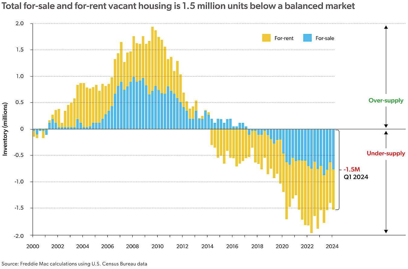 米国の住宅公社の一つが2024年に行った推計によると、150万戸の住宅が不足しています。既存の持ち家の空室率は0.8%しかなく、自身の住まいとして住宅を借りたり購入したい人の需要が満たされていません。これだけの慢性的な供給不足は、数年の短い期間で解消するものではありません。米国全体では、売主・貸主の優位が続きます。